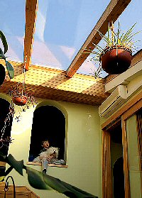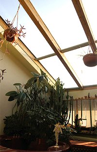 mansarde. Zaradi velikih zastekljenih površin je boljši stik z okolico oziroma čudovit razgled na pokrajino in v nebo. Nadvse prijetno je ležati na ležalniku ali džakuziju in gledati skozi streho v zvezdnato nebo ali opazovati naletavanje snežink. Podoben učinek kot steklena streha doseže tudi kombinacija več strešnih oken.
